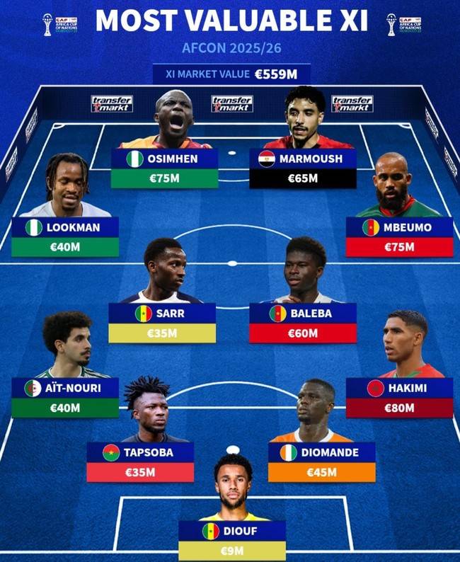 축구통계매체 '트랜스퍼마크트'는 22일(이하 한국시간) 네이션스컵에서 가치가 높은 11명을 베스트 일레븐으로 나열했다.