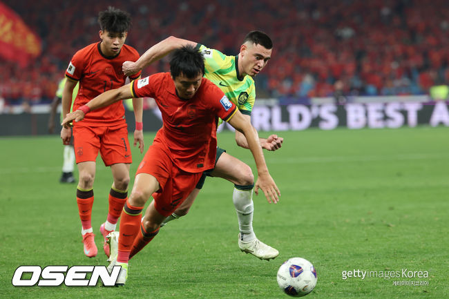 중국 대표팀은 지난 25일 중국 항저우 항저우 스포츠파크 경기장에서 열린 2026 국제축구연맹(FIFA) 북중미 월드컵 아시아지역 3차예선 C조 8차전에서 호주에 0-2로 완패했다. 베테랑 골키퍼 왕다레이가 굴러오는 공을 다리 사이로 흘려보내는 치명적 실수를 저지르면서 고개를 떨궜다.
