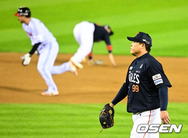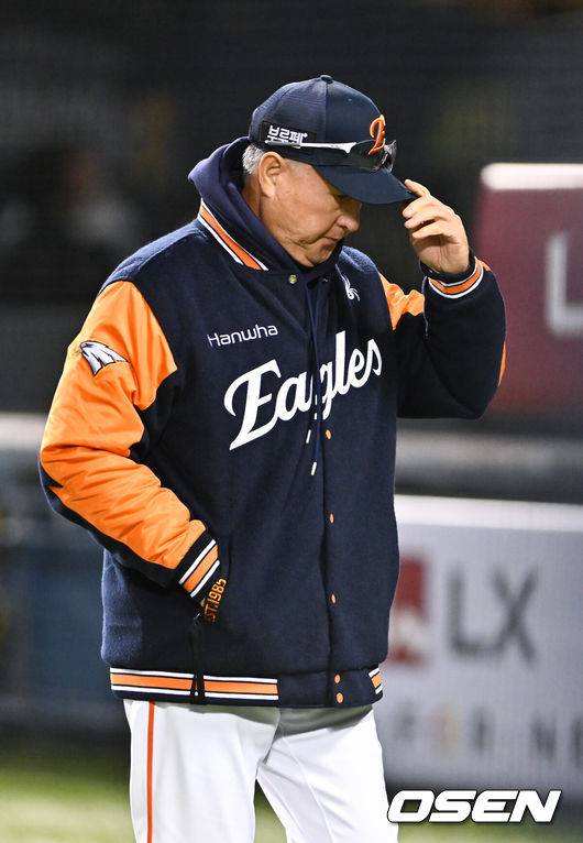 올 가을야구 7경기에서 한화의 선발 평균자책점은 7.28. 정규시즌(3.55) 기록보다 두 배 이상 폭등했다. 7경기 중 5경기에서 5회 이전에 강판됐다. 선발이 긴 이닝을 끌고가지 못하면서 경기 흐름을 내줬고, 불펜도 피로 누적 영향인지 시즌 때보다 힘이 떨어졌다. 문동주의 기록을 제외한 순수 한화 불펜의 이번 포스트시즌 평균자책점은 8.14로 좋지 않다. 불펜에 믿을 수 있는 카드들이 많지 않다 보니 선발 교체도 칼같이 하기 어렵다. 김경문 감독이 어떻게 손을 쓰기 어려울 만큼 선발들의 난조가 예상 밖 수준이다.