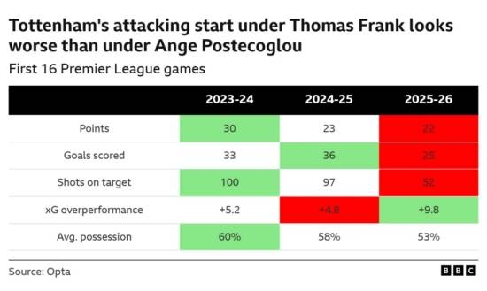 현재 프랭크와 부진했던 2024-2025시즌 포스테코글루 감독의 리그 스탯을 비교한 BBC는 공격 지표와 수비 지표에서 차이가 있다고 설명했다.