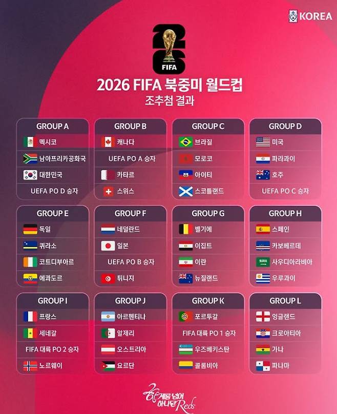 투헬 감독이 말대로라면 한국 축구는 FIFA 랭킹 20위권 밖이라 초대받지 못했다는 것이다. 대한민국의 FIFA 랭킹은 22위다. 홍명보호는 북중미월드컵에서 개최국 멕시코를 비롯해 아프리카의 남아프리카공화국, 유럽 플레이오프(PO) D승자와 함께 A조에 편성됐다. 유럽 PO D조에는 덴마크, 북마케도니아, 아일랜드, 체코가 내년 3월 한 장의 본선행 티켓을 놓고 다툰다. 현재로선 덴마크가 유력하다.