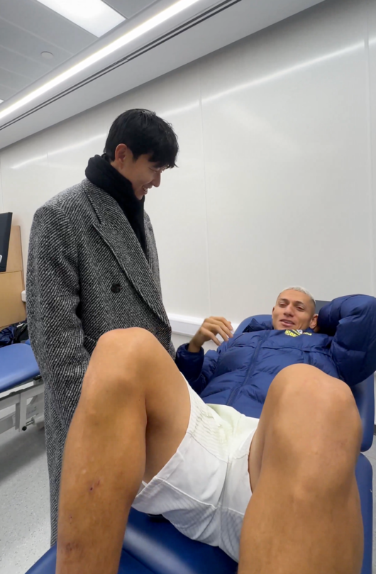 옆 침대에 누워있던 히샬리송도 손흥민을 반겼다. 그는 손흥민을 보자마자 카메라를 향해 "이 남자는 내 덕분에 트로피를 들었다"라고 주장했다. 그러자 손흥민은 "아니다. 브레넌 존슨(UEL 결승전 득점자) 덕분이다"라며 투닥거렸다. 히샬리송은 손흥민이 계속해서 존슨 덕분이라고 반박하자 "결승에서 메시나 만나라"라고 말해 모두를 웃게 했다.