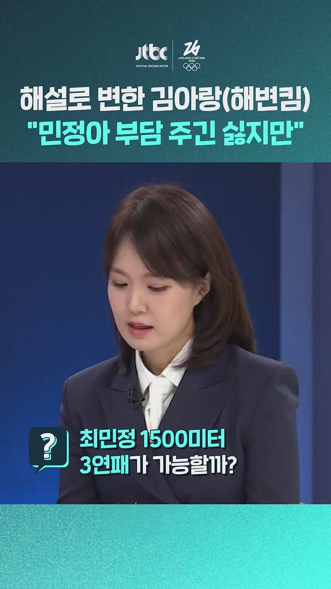 평창과 베이징을 함께 누볐던 '단짝'에서, 이제는 마이크를 잡고 후배를 응원하는 해설위원이 되었습니다. 어제(1일) JTBC 뉴스룸에 출연한 김아랑 위원. 최민정 선수의 올림픽 3연패 가능성을 묻자 "미안하지만 기대를 걸고 싶다"며 솔직하고 귀여운 영상 편지를 남겼는데요. 가장 가까이서 지켜본 선배가 말하는 '최민정이 무서운 이유'까지, [지금, 올림픽]에서 전해드립니다.