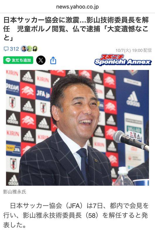 [OSEN=고성환 기자] 일본 축구계가 한 명의 일탈로 인해 국제적 망신을 당했다. 일본 내에서도 가게야마 마사나가 일본 축구협회(JFA) 전 기술위원장의 아동 포르노 사태가 국가 전체의 이미지를 깎아내렸다며 한숨을 내쉬고 있다.