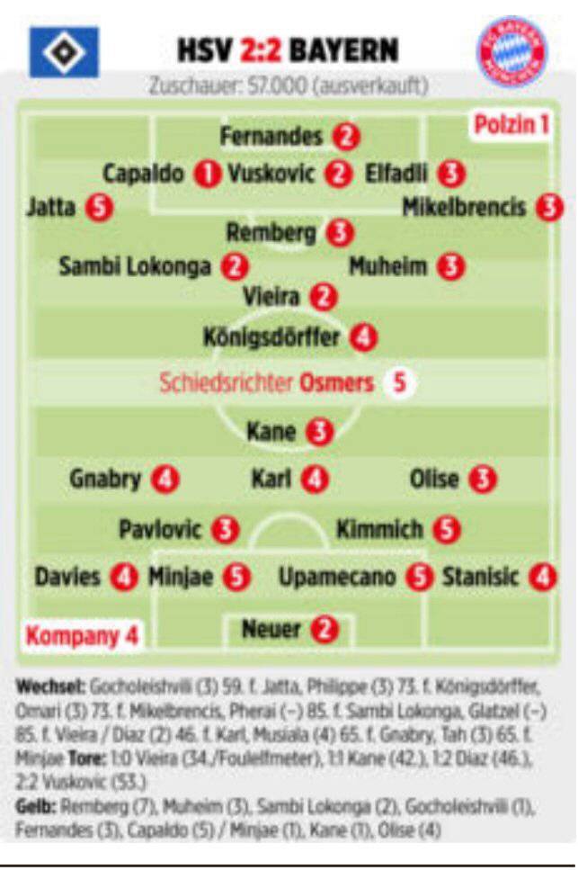 함부르크 역시 억울한 판정이 많았다. 전반 3분 거칠고 무모한 태클을 가한 케인은 경고조차 받지 않았다. 이날 유달라 거친 양상의 경기에서 함부르크 선수 6명이 경고를 받았다. 뮌헨은 김민재 포함 4명이다.