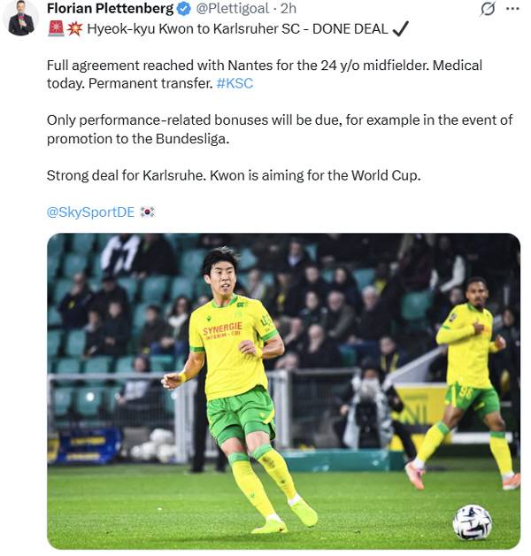 독일 매체 '스카이'는 31일(한국시각), "독일 2.분데스리가(2부) 클럽 카를스루에가 낭트(프랑스)의 중앙 미드필더 권혁규를 영입했다. 계약기간은 2028년까지로, 메디컬테스트를 이미 완료했다"라고 보도했다.