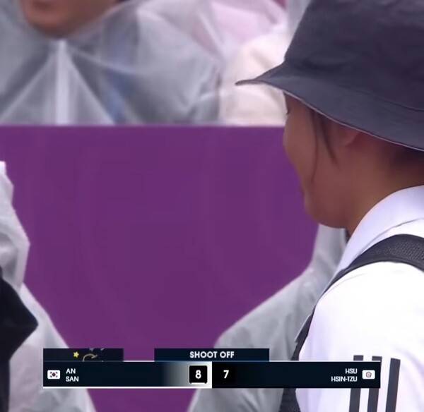 특히 5세트엔 18-7 상황에서 9점을 쏘며 격차를 벌리는 듯했지만, 돋보기 판독 끝에 상대 8점짜리 화살이 9점으로 번복되는 불운을 겪었다. 이에 두 선수의 승부는 슛오프에서 판가름 나게 됐고, 안산이 먼저 8점을 쏘며 패색이 질었다. 하지만 부담감 탓인지 쉬신쯔는 7점을 쏘며 안산에 금메달을 내줬다.
