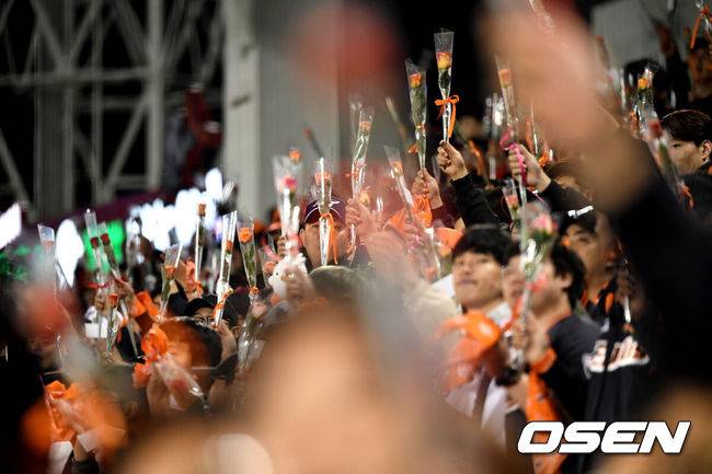 김승연 회장은 7년 전 2018년 준플레이오프 1차전을 앞두고도 11년 만의 가을야구를 기다린 팬들에게 감사의 의미로 장미꽃을 선물해 큰 화제가 됐다. 당시 대전 한화생명이글스파크 1만3000석 전 좌석에 장미꽃이 한 송이씩 꽂혔고, 비용은 약 4000만원에 달했다. 그 이후 한화가 다시 가을야구에 오르기까지 7년의 시간이 더 걸렸다. 대전 신구장 첫 해를 맞아 2위로 플레이오프에 직행했고, 이날 2차전을 패배를 하긴 했지만 1승1패로 대구 원정을 향하며 한국시리즈 우승의 꿈을 이어간다.