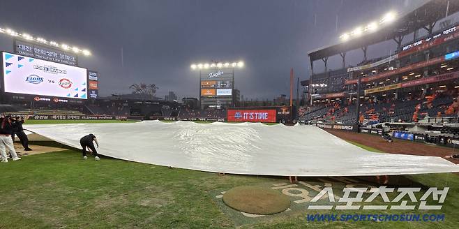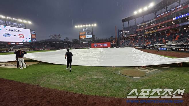 그라운드에는 대형 방수포가 깔렸지만, 물폭탄에 그라운드가 빠르게 젖어 들어갔다.