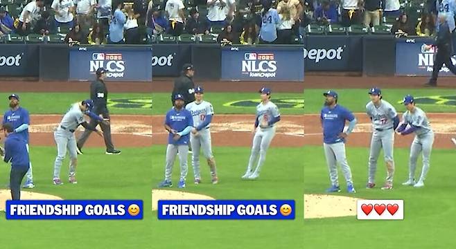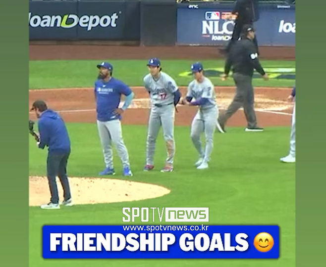 메이저리그 인스타그램 계정은 16일 전날(15일) 다저스가 챔피언십시리즈 2차전을 마친 뒤 중계 화면으로는 볼 수 없었던 선수단의 사소하고 귀여운 모습을 공개했다. 오타니가 먼저 그라운드로 나가 테오스카 에르난데스 뒤에 서고, 마치 깜빡한 것이 있다는 듯 뒤를 돌아보며 두 손으로 공손하게 누군가를 모시는 장면이다.