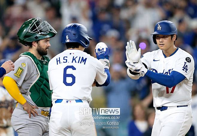 [스포티비뉴스=신원철 기자] 오타니 쇼헤이가 김혜성을 부르며 손짓을 한다. 김혜성이 폴짝 뛰어 오타니 뒤에 서더니 약속한 듯 '노룩 하이파이브'로 승리를 자축한다. LA 다저스 김혜성과 오타니의 '절친 모먼트'를 메이저리그 공식 SNS 계정이 놓치지 않았다. 두 선수의 우정이 돋보인 장면이라면서 하트 이모티콘을 달았다.