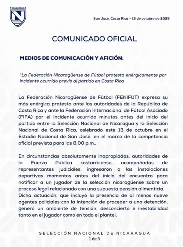 상황은 거기서 끝나지 않았다. 니카라과축구연맹(FENIFUT)은 14일 이 스캔들을 '용납할 수 없고 정당화될 수 없다'라고 규정하고 코스타리카 당국과 FIFA에 공식 항의하겠다는 내용의 성명을 발표했다. '모든 국가의 법치주의와 현행법을 절대적으로 존중하며, 모든 사람은 위자료 관련 의무를 포함하여 법적 의무를 준수해야 한다. 그러나 우리는 선수의 정서적 고결성을 훼손하고, 팀의 준비를 방해하며, 모든 국제 경기에서 반드시 지켜야 할 스포츠맨십을 훼손하는 이번 조치가 시행된 방식, 시기, 그리고 맥락을 단호히 거부한다"라고 밝혔다.
