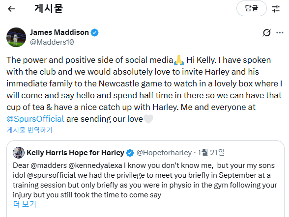 토트넘 관련 소식을 전문적으로 다루는 영국 매체 '투 더 레인 앤드 백'은 23일(한국시간) "소셜미디어의 긍정적인 힘이 매디슨을 한 어린 팬에게로 이끌었다"며 매디슨의 감동적인 미담을 집중 조명했다.
