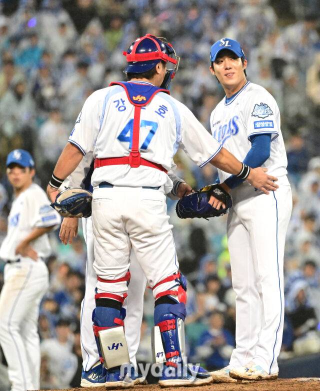 원태인을 제일 잘 아는 선수가 강민호다. 지난 준플레이오프 3차전이 대표적인 예다. 이날 원태인은 6⅔이닝 5피안타 2사사구 5탈삼진 1실점으로 호투했다. 그런데 5피안타 중 3피안타를 체인지업으로 내줬다. 강민호는 이를 빠르게 캐치해 볼 배합을 바꿨다. 당시 강민호는 "제가 생각했던 것보다 체인지업이 맞아 나가는 게 많아서 빨리 패턴을 바꿨다. 직구랑 슬라이더로 횡적으로 바꾼 게 잘 먹혔다"고 말했다.