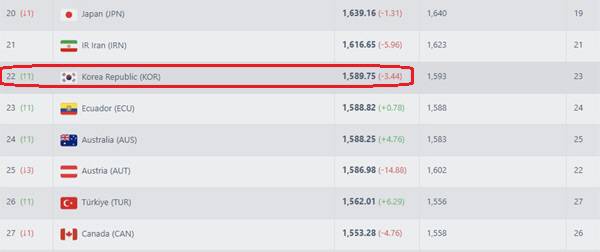 대한민국 축구 A대표팀이 브라질전 0대5 대패에도 국제축구연맹(FIFA) 랭킹이 소폭 상승한 것으로 나타났다. A매치 결과를 기반으로 실시간 FIFA 랭킹을 집계하는 사이트 '풋볼 랭킹'에 따르면, 13일(이하 한국시각) 현재 한국의 랭킹은 23위에서 22위로 한 계단 점프했다.