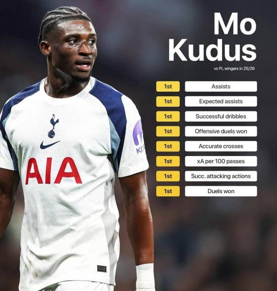 축구 통계 사이트 '스쿼카'에 따르면, 현재 드리블 성공 횟수는 쿠두스가 30회로 프리미어리그 전체 1위다. 이는 야쿠바 민테(브라이턴 앤드 호브 앨비언)가 기록한 19회보다도 10회 이상 많은 수치다.