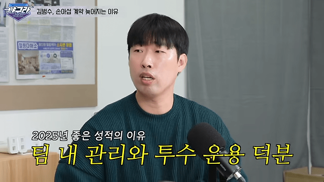 이에 대해 이재곤 위원은 "2025시즌 좋은 기록이 나온 것은 팀에서 관리해 준 게 큰 몫을 했다고 본다. 김범수의 활용법을 제대로 알고 접근했기 때문에 좋은 성적이 나왔다"라며 한화 코칭 스태프의 적절한 기용 방식이 김범수의 커리어 하이로 연결됐다는 의견을 내놨다.