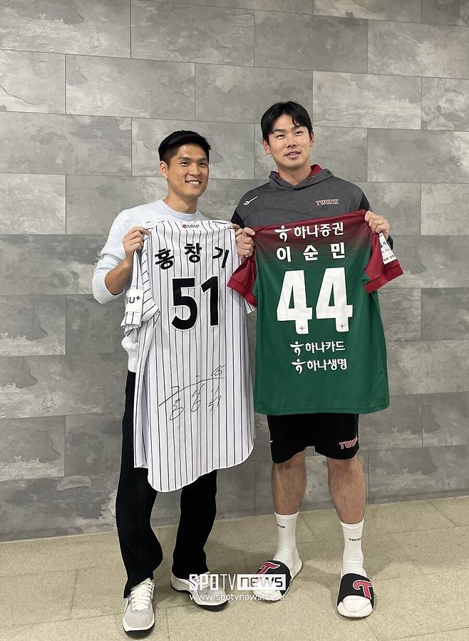 [스포티비뉴스=잠실, 신원철 기자] KBO리그 1위와 K리그 1위가 만났다. LG 트윈스 외야수 홍창기와 대전 하나 시티즌 미드필더 이순민이 서로의 선전을 기원했다.