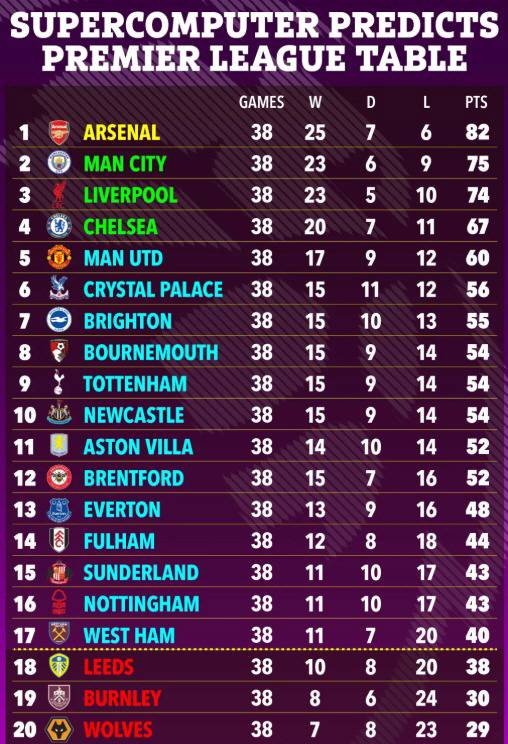 맨시티가 2위(승점 75)로 올라선 가운데 리버풀은 최근 6경기에서 1승5패지만 3위(승점 74)를 차지할 것으로 예상됐다. 현재의 1~3위는 아스널, 맨시티, 첼시다. 리버풀은 8위로 떨어져 있다.