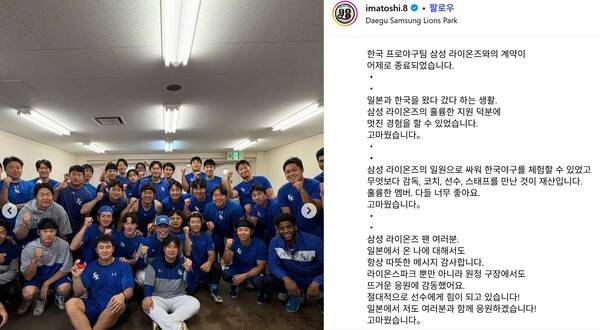 한편, 이마에는 올 시즌 삼성의 QC 코치로 선임됐다. 지난 2월 스프링캠프 기간 일본 오키나와 전지훈련에 참여한 뒤 본격적으로 팀에 합류했다. 야수 파트를 중심으로 타격·수비·주루 등 전반을 지도했다. 최근 구단과 계약이 만료돼 일본으로 돌아간 것으로 알려졌다.