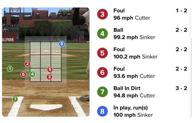 이정후는 기사회생했고 다시 집중력을 발휘했다. 5구 100.2마일(161.3km) 싱커, 6구 93.6마일(150.6km) 커터를 모두 파울로 걷어냈다. 그리고 7구째 94.8마일 커터가 바깥쪽으로 바운드 됐다. 풀카운트 승부까지 끌고 왔다. 이정후는 집념의 8구 승부 끝에 결과를 만들었다.