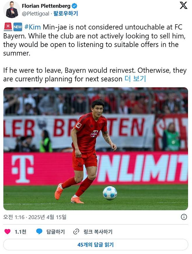 독일 매체 '스카이스포츠'의 플로리안 플레텐베르크 기자는 15일(이하 한국시간) 뮌헨이 김민재를 매각할 것이라는 충격적 보도를 내놓았다. 플레텐베르크 기자는 "뮌헨은 더 이상 김민재를 대체 불가한 존재로 여기지 않는다"며 "오는 여름 이적시장에서 제안을 들어볼 생각"이라고 밝혔다.