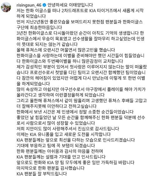 대전 생활에 대한 아쉬움을 뒤로 하고 새 팀 KIA를 향한 기대감도 드러냈다. 이범호 KIA 감독은 그저 아프지 말라고 당부만 했다는 후문. 이태양은 "KIA는 지난해 우승팀이고 기본적으로 전력이 굉장히 탄탄한 팀이다. 올해는 부상자가 많이 나오면서 힘든 시즌을 겪었는데, 그 부분만 해결된다면 KIA가 다시 우승할 수 있을 거라 생각한다"라고 힘줘 말했다.