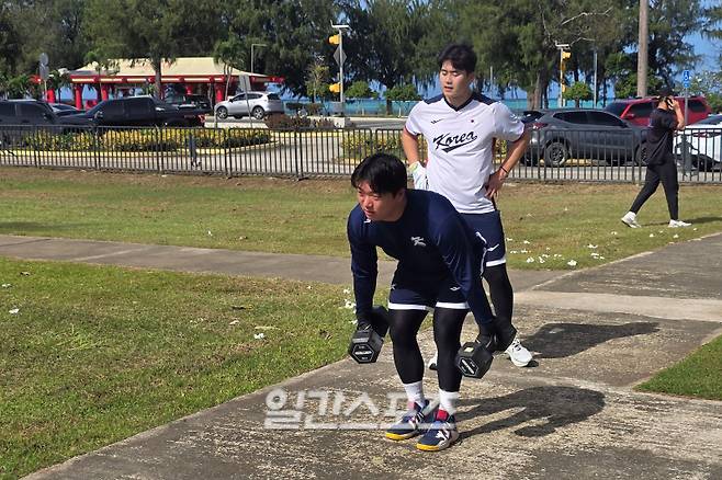 "글러브 터질 것 같아요" 고우석 공에 절레절레, 박영현 "우석이 형, 많이 배우고 싶어요" [IS 사이판]