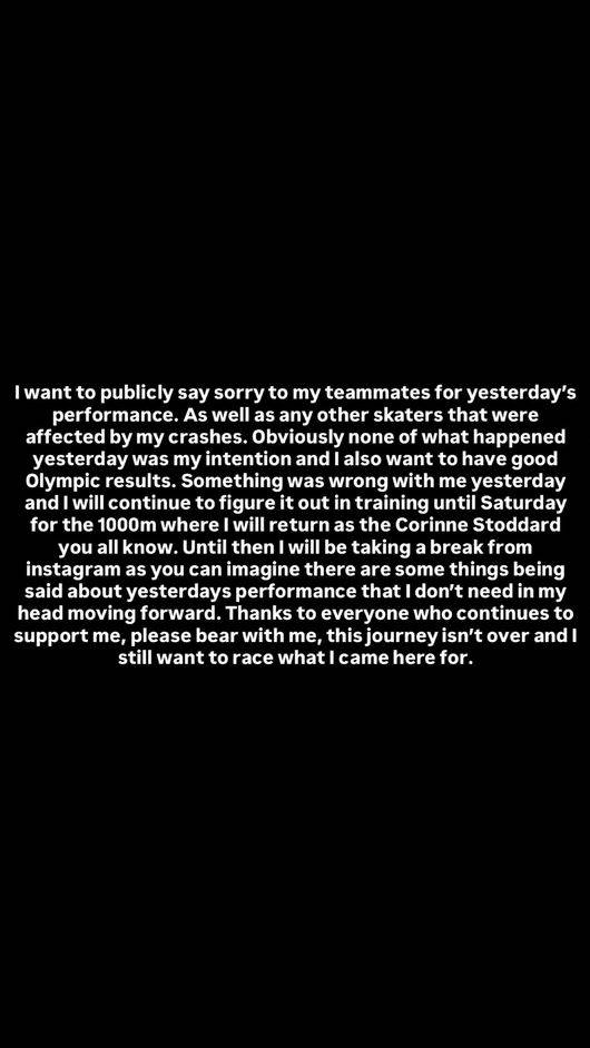 이어 스토더드는 "어제 일어난 일은 절대 내 의도가 아니었다. 나 역시 올림픽에서 좋은 결과를 내고 싶다. 어제 내 몸 상태에 문제가 있었던 것 같다. 토요일 1000m 경기까지 훈련을 통해 원인을 찾아내겠다. 그때는 여러분이 알고 계시는 코린 스토더드의 모습으로 돌아오겠다"라고 다짐했다.