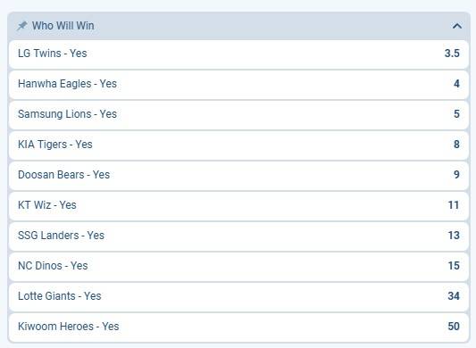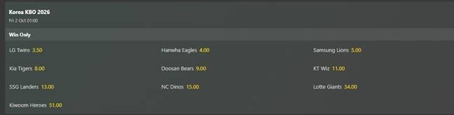 영국을 기반으로 하는 BET365와 키프로스에 본부를 두고 있는 1xbet 등 해외 주요 베팅 업체들이 발표한 2026시즌 KBO 리그 우승 배당률에 따르면 '2025시즌' 통합 우승팀 LG가 가장 낮은 3.5배를 책정받아 우승 1순위 유력 후보로 예측됐다.