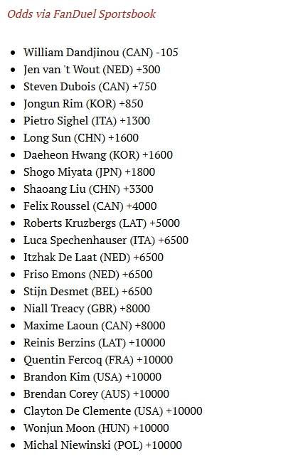 피에르로 시겔(이탈리아)은 +1300으로 5위 칸을 점유했고 황대헌은 금메달 배당률 +1600으로 쑨룽과 나란히 공동 6위를 마크했다.