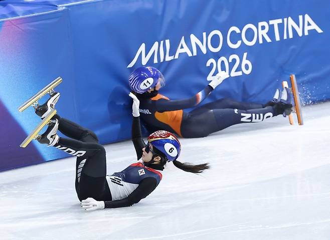 15일(한국시간) 이탈리아 밀라노에서 열린 쇼트트랙 여자 1000m 예선 현장. 김길리가 또 넘어졌다.
