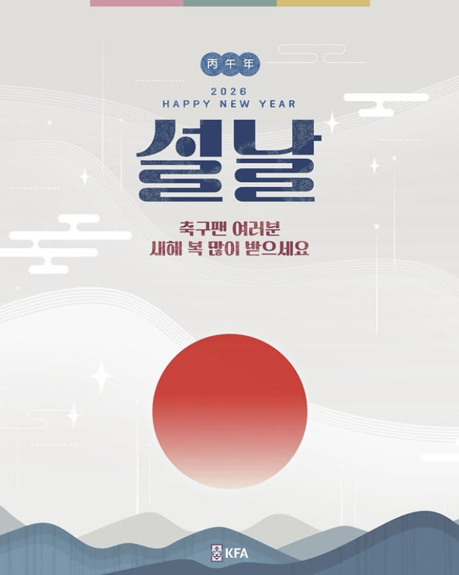 대한축구협회는 17일 오전에 "축구팬 여러분, 편안하고 행복한 설 명절 보내세요"라는 인사와 함께 크고 둥그런 붉은 해가 산 위에 떠오르는 이미지를 게재했다.