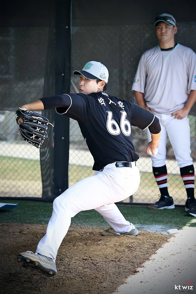 17일 KT 구단 유튜브에 따르면 박지훈은 제춘모 코치의 조언을 들은 뒤 투구를 시작했다. 제 코치는 "정확하게 보고, 정확하게 던져야 한다"고 강조했다. 투구 시 바운드도 체크했다.