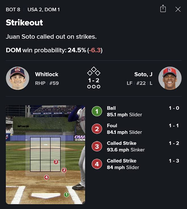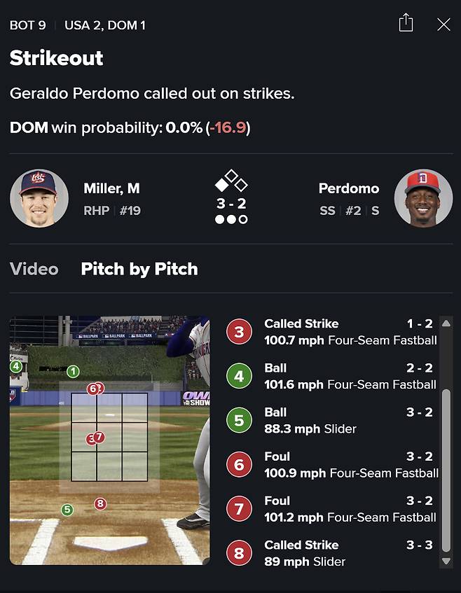 마지막 8구째. 밀러의 선택은 슬라이더였고, 앞서 8회 소토 타석 때보다 훨씬 더 낮게 떨어졌다. 페르도모가 볼을 잘 골라낸 상황. 그런데 주심의 판정은 스트라이크였다. 루킹 삼진으로 경기 종료. 도미니카공화국으로선 매우 허무한 탈락 순간이었다.