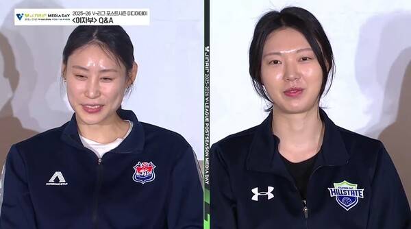[스포츠한국 김성수 기자] 은퇴를 앞둔 양효진(현대건설)과 드래프트 동기이자 친구인 배유나(도로공사)가 포스트시즌, 그리고 챔피언결정전을 바라보며 재치 있는 각오 싸움을 펼쳤다.