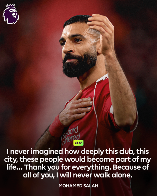 살라는 리버풀 팬들에게 미리 영상 편지를 남겼다. 그는 "안타깝게도 이 날이 왔다. 이게 제 작별의 첫 번째 메시지다. 저는 시즌이 끝나면 리버풀을 떠난다. 이 클럽, 이 도시, 그리고 이 사람들이 제 삶의 얼마나 큰 일부가 될지 상상도 못 했다"라고 말문을 열었다.