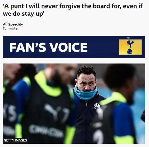 그리고 데 제르비 감독의 선임 이후 한 토트넘팬은 영국 공영방송 'BBC'의 '팬 보이스(Fan Voice)' 코너를 통해 데 제르비 감독 선임을 강하게 비판했다.