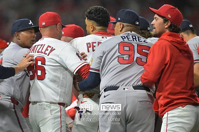 [스포티비뉴스=신원철 기자] 에인절스타디움에서 초대형 벤치클리어링이 발생했다. 2년 전 애틀랜타 브레이브스에서 함께 뛰었던 투수 레이날도 로페스(애틀랜타)와 외야수 호르헤 솔레어(LA 에인절스)가 주먹다짐을 벌이면서 벤치클리어링으로 이어졌다. 두 선수 모두와 인연이 있는 애틀랜타 월트 와이스 감독이 몸을 날려 두 선수를 떼어놨다.