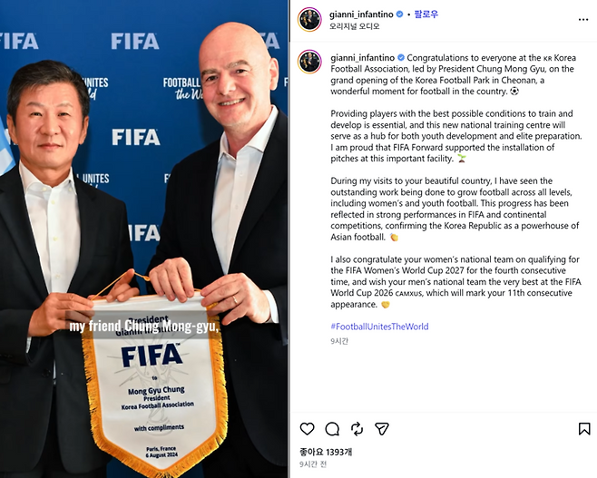 인판티노 회장은 8일 자신의 SNS를 통해 "대한축구협회(KFA) 정몽규 회장을 비롯한 모든 관계자 여러분, 코리아풋볼파크 개관을 진심으로 축하드린다"며 "이는 한국 축구에 있어 정말 뜻깊은 순간"이라고 말했다.