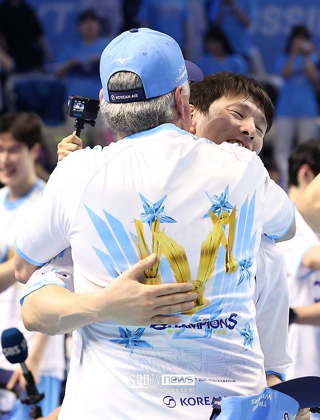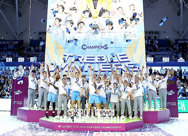 대한항공은 10일 인천 계양체육관에서 열린 진에어 2025~2026 V리그 남자부 챔피언결정전(5전3선승제) 5차전 홈경기에서 현대캐피탈을 세트스코어 3-1(25-18 25-21 19-25 25-23)로 꺾고 우승 트로피를 거머쥐었다.
