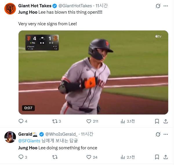 가장 눈에 띄는 건 팬들의 노골적인 '자기 반성'이었다. X(구 트위터)에선 "지금껏 이정후를 비판했던 사람들은 스스로를 바보라고 생각해야 한다"고 의견이 나왔다. "시즌은 길다. 고작 13경기 만에 선수를 평가하는 건 말이 안 된다"며 초반 비판을 정면으로 부정하는 시선도 있었다.