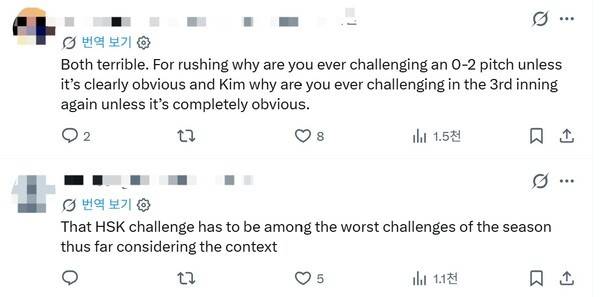팬들의 반응도 거셌다. 그의 게시글에 "둘 다 형편없다. 러싱은 왜 볼카운트 0-2 상황에서 그렇게 명백하지도 않은 공에 챌린지를 하는 거고, 김혜성은 왜 그렇게 완전히 확실하지도 않은 상황에서 또 챌린지를 하는 거야?", "김혜성의 챌린지는 그 상황을 고려하면 올 시즌 지금까지 나온 챌린지 중에서도 최악의 하나로 꼽힌다" 등 부정적인 댓글이 쏟아졌다.