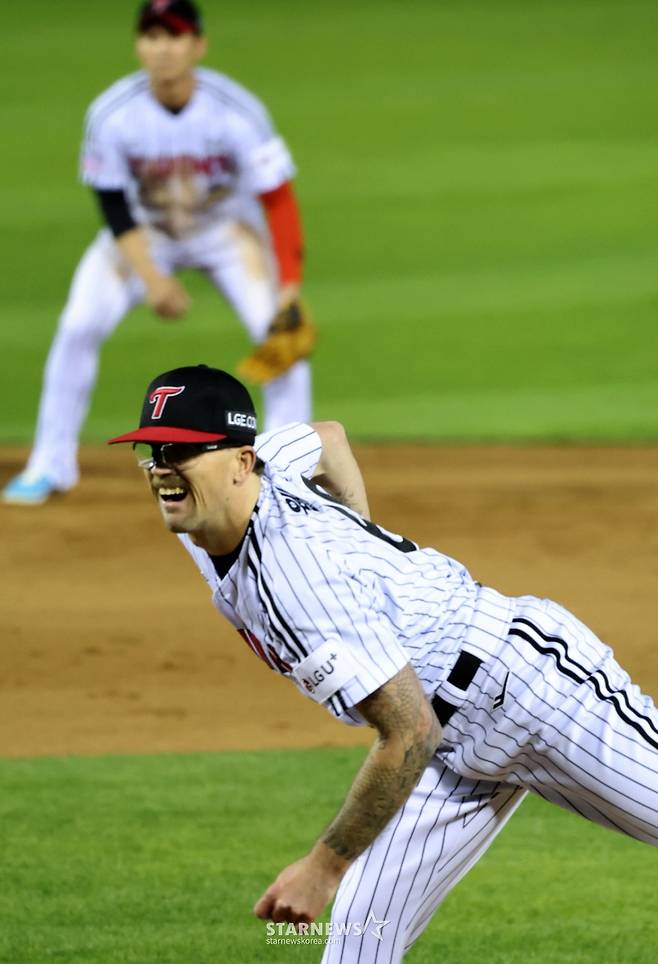 한화 이글스 타선을 압도했다. 8이닝 동안 피안타는 단 하나에 불과했다. 그러나 9회초 마운드에 오른 건 라클란 웰스(29·LG 트윈스)가 아닌 마무리 유영찬(29)이었다.