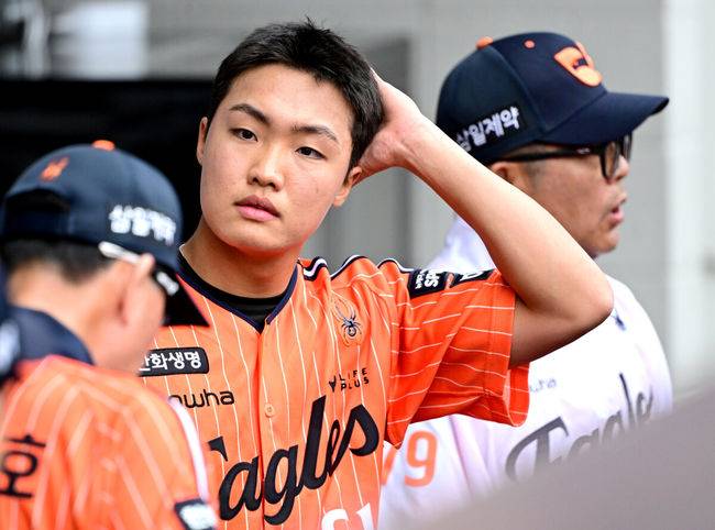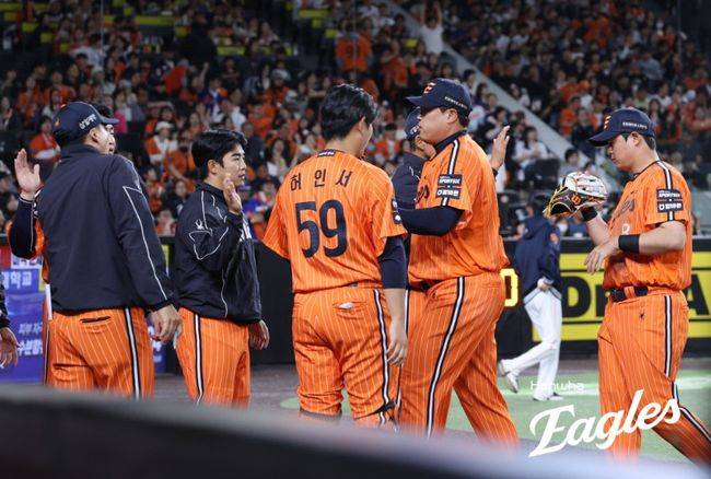 이후 김서현(⅓이닝 1피안타 1볼넷 무실점)-조동욱(⅓이닝 2피안타 무실점)-박상원(⅔이닝 1피안타 무실점)-정우주(1이닝 1피안타 3볼넷 1실점)-이민우(1⅔이닝 1피안타 1볼넷 무실점)-김종수(⅓이닝 1피안타 무실점)-쿠싱(2이닝 3피안타(1피홈런) 1탈삼진 1실점)이 이어 던졌다.