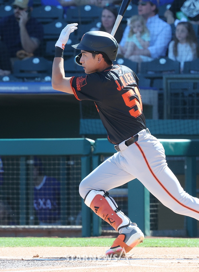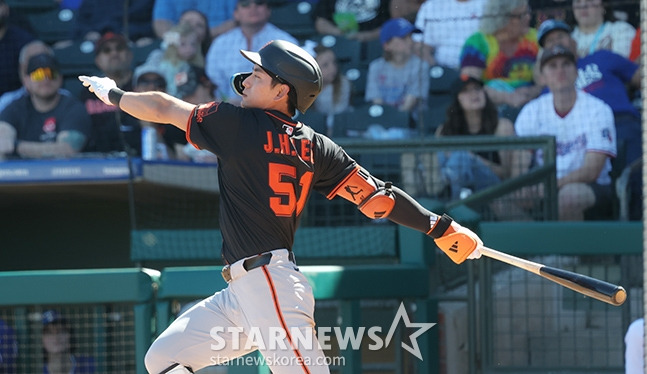 이정후는 23일(한국시간) 미국 애리조나주 서프라이즈의 서프라이즈 스타디움에서 열리는 텍사스 레인저스와 2025 메이저리그(ML) 시범경기 개막전에서 3번 타자 및 중견수로 선발 출전해 1회 첫 타석부터 우전 안타를 터트렸다. 하지만 이후 타석에서는 삼진, 1루 땅볼 아웃으로 각각 물러나며 아쉬움을 삼켰다.