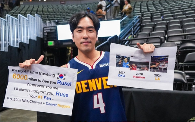 이 한국 팬은 "웨스트브룩을 보기 위해 6000마일을 날아왔다. 4번째 미국 여행이고 당신이 어디에 있든 응원할 것이다. 2025년 NBA 챔피언은 덴버"라는 문구가 적힌 플래카드를 들어 열혈 응원을 펼쳤다. 웨스트브룩이 직접 선물한 유니폼을 건네받은 이 팬은 머리를 감싸 쥐며 기쁨을 숨기지 못했다. 그리고 나선 카메라를 향해 "믿을 수 없는 순간이다. 나는 항상 러셀을 응원해왔다"고 외쳤다.